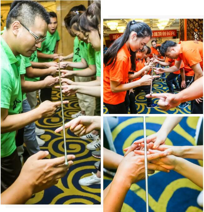 大家共同用食指支撐魚竿,不能有人手指離開魚竿的情況下將魚竿從頭至尾放到地上。取名簡(jiǎn)單任務(wù)實(shí)則一點(diǎn)也不簡(jiǎn)單,不允許有任何人出現(xiàn)失誤,一人不動(dòng)則整體不動(dòng),一人動(dòng)作快則導(dǎo)致整體分崩離析。