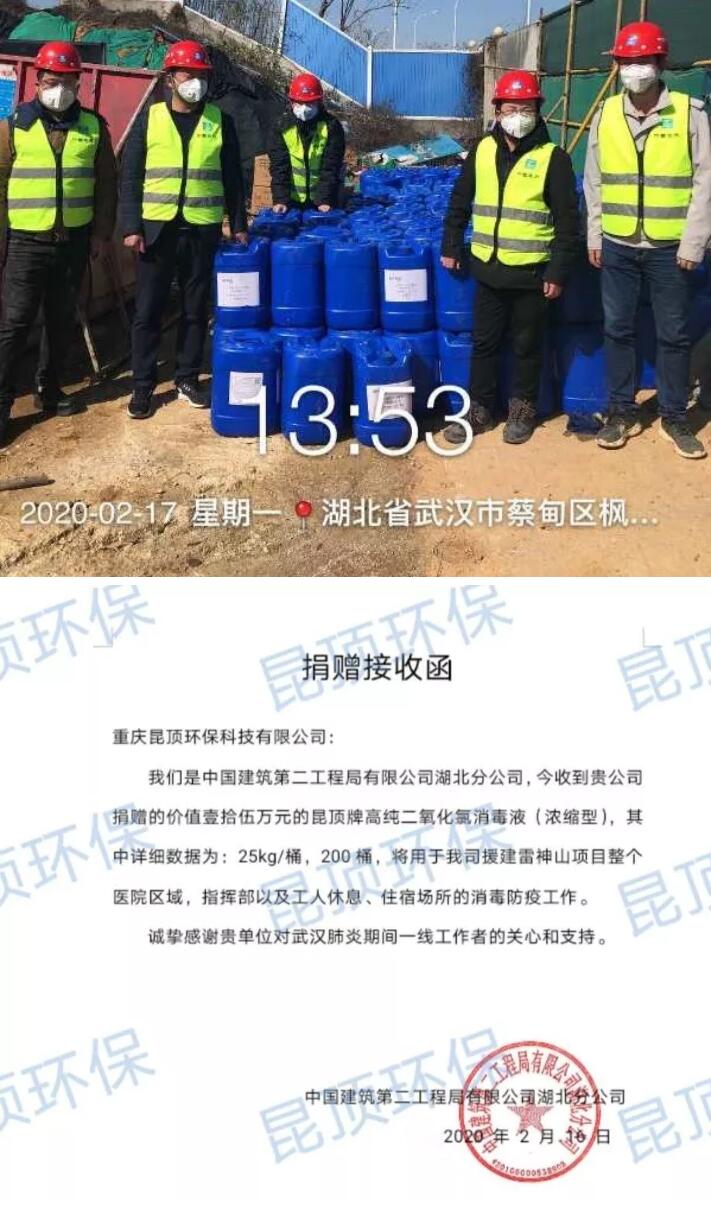 2月17日,昆頂環(huán)保向援建雷神山醫(yī)院的中國建筑第二工程局有限公司湖北分公司現場指揮部提供的消毒防疫物資,順利抵達武漢。這批物資為200桶高純二氧化氯消毒液,可稀釋成500噸消毒液對環(huán)境噴灑消毒,用于保障醫(yī)院區(qū)域、指揮部以及現場建設工作人員的疾病防控安全。