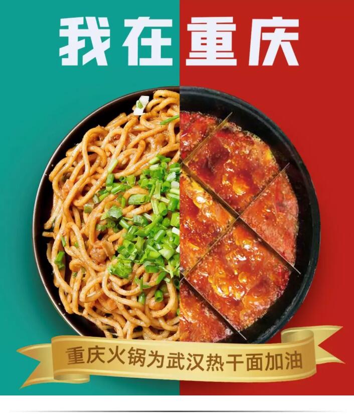 匹夫有責,義不容辭,相信在全體中華兒女的共同努力下,我們一定會打贏這場抗"疫"攻堅戰(zhàn)!春天會如約而至,冬天失去的,我們必將奪回來!重慶火鍋為武漢熱干面加油!